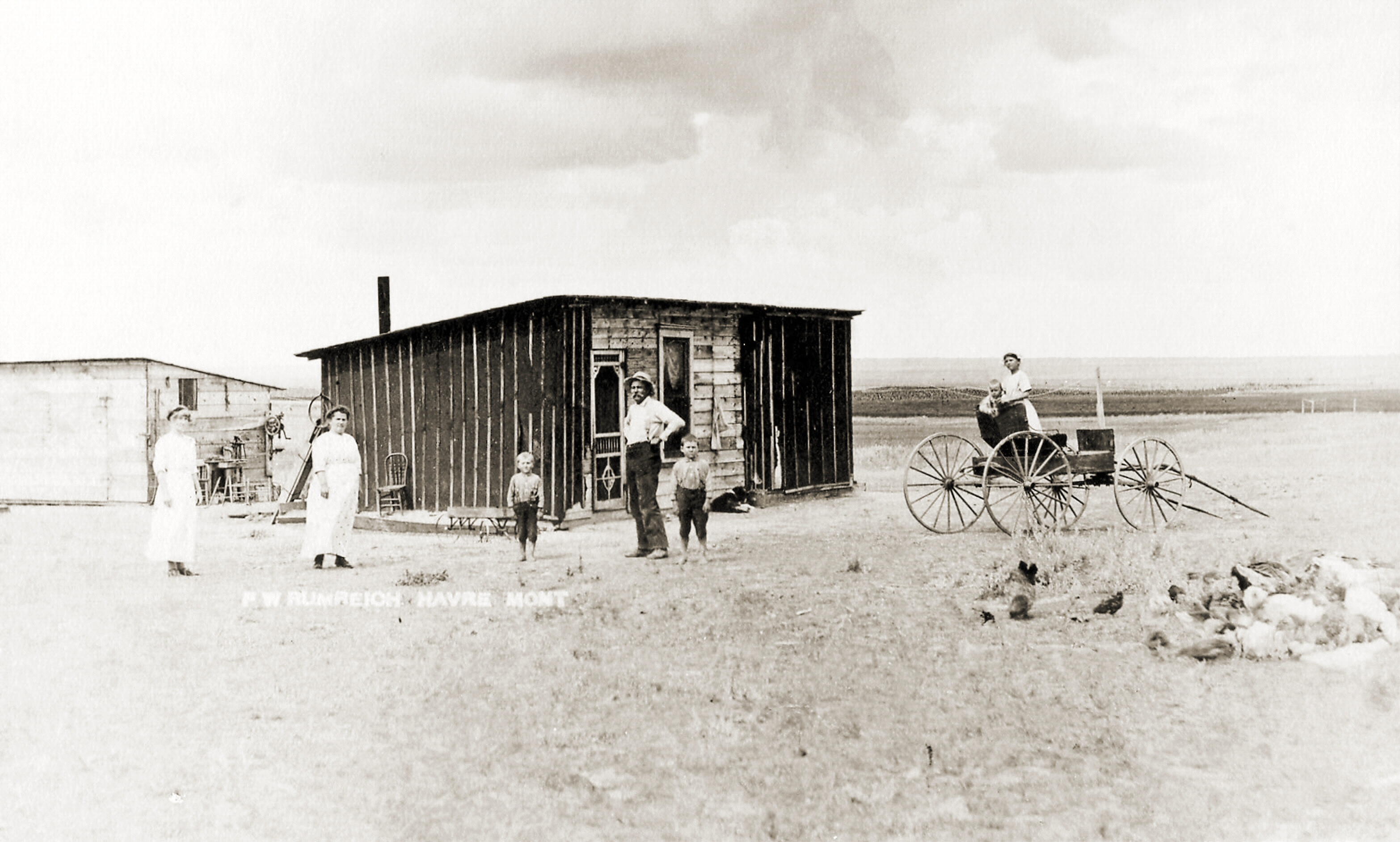 Hello brother-in-law and sister So here you have us. All we have to eat is fried chicken, nothing else. Ha Ha. This is our 320 acre residence. How do you like it? Have you threshed yet? We will start Sat. or Monday. Grain is real ripe. Wheat may run 25 or 30 bushels per acre. Oats 25 to ? Scratch us a few lines and stay healthy. Go with God F. R. |