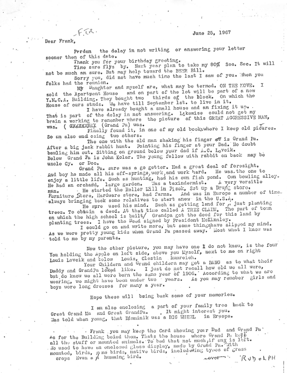 I am also enclosing a part of your family tree back to great grandma and great Grand Pa. It might interest you. Was told when young, that Domminik was a BIG WHEEL in Europe.