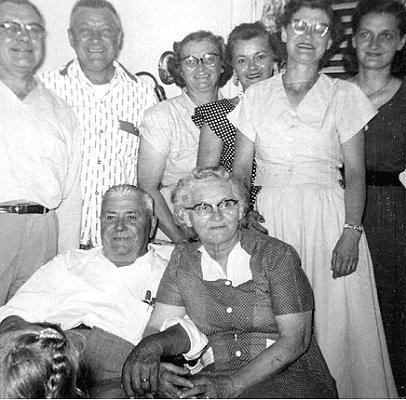 John K. and Barbara Rumreich's 50th wedding anniversary. Standing left to right are Toby, Bo, Lou, Marcy, Millie and Irene.