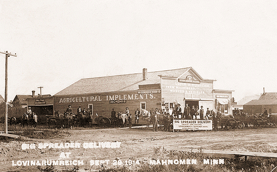 John K. Rumreich operated an implement store most of his life. He later moved his business to a different building after this one burned down. Taken at Mahnomen on September 29, 1914. Courtesy of Bob Schnittger. |