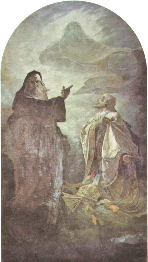 On the left central part is Saint Cyril in a brownish monk's garb. His right hand points toward the picture of God, the Creator of the world. Under his feet are the defeated idols of the pagan Slavs.