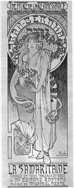 "The world quickly became familiar with Mucha's larger-than-life posters of Sarah Bernhardt in her many roles, from 'Hamlet' to 'Camille'."11 Mucha not only designed posters for her, but some of her sets and costumes as well. Mucha became the most sought after artist in Paris.