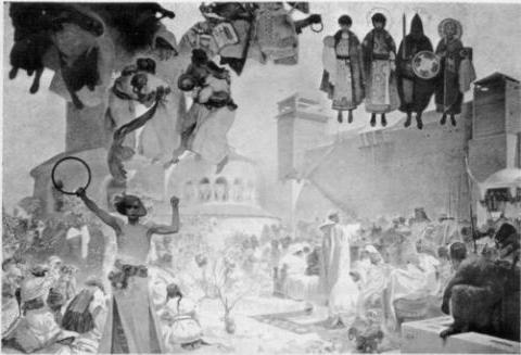 Alfons Mucha spent the last years of his life working, at the Castle Zbirvo in Bohemia, on a series of academic pictures portraying the history of his people. Alfons called this cycle of 20 huge paintings the Slav Epic, and it took him over 18 years to complete. He painted the first three pictures - each 6x8 meters (194 ft. x 26 ft.) in size - in quick succession. "They are among the best.